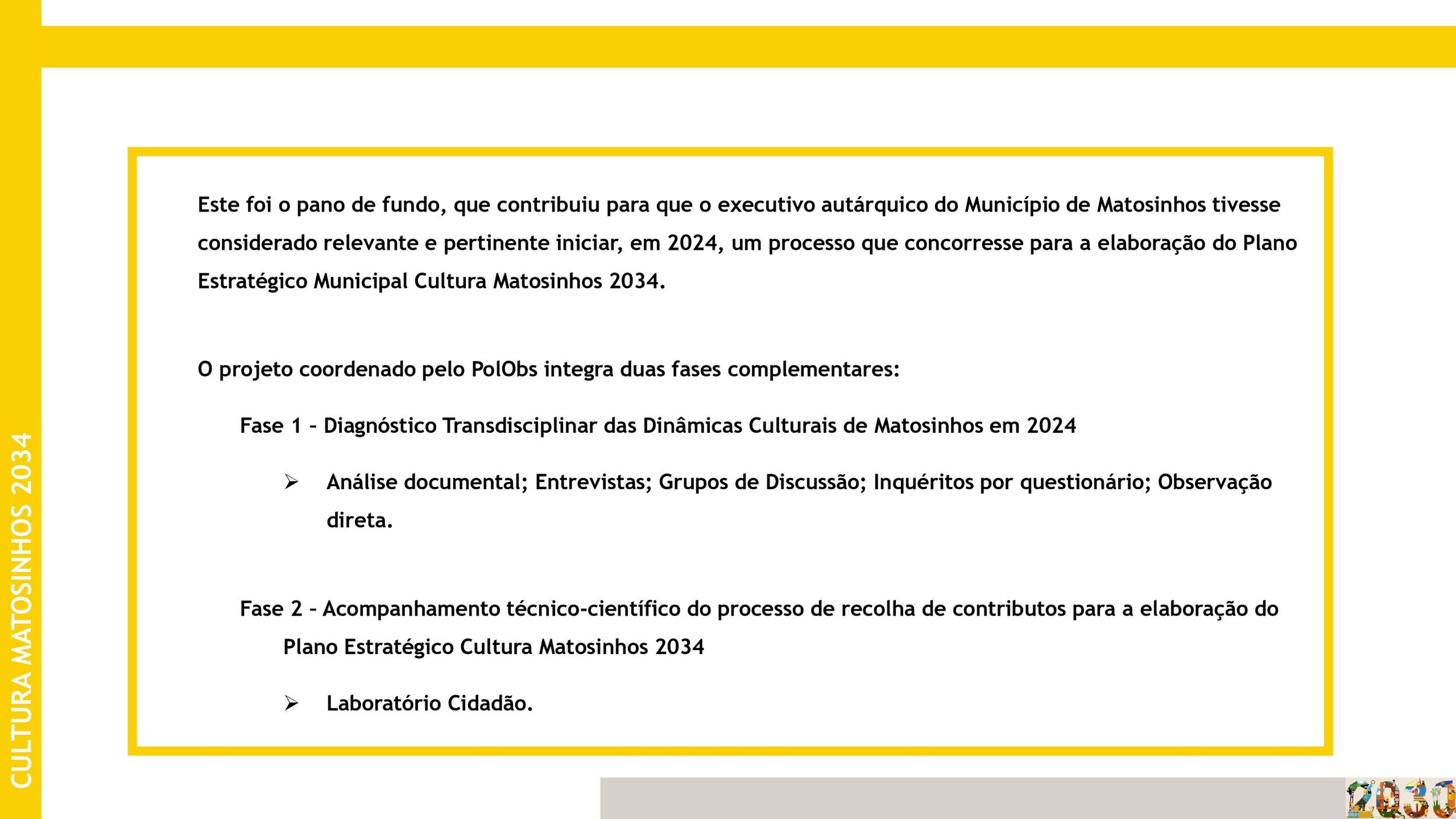 A elaboração do plano irá decorrer faseadamente e pretende ser um processo colaborativo e participativo, recolhendo o contributo das comunidades cultural, desportiva, económica e académica.