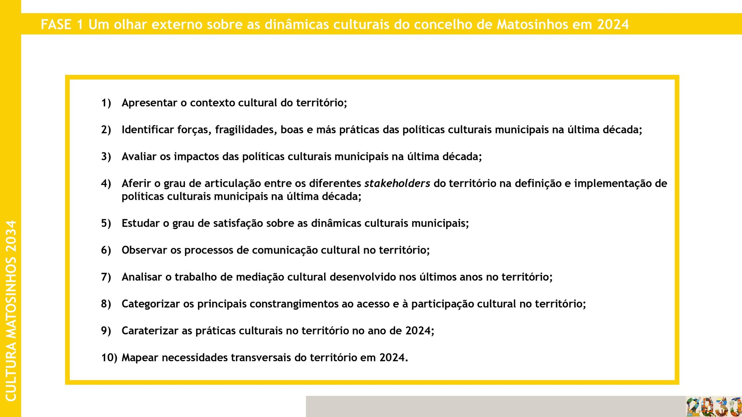 Para o efeito, irá analisar vários fatores associados à atividade cultural municipal, nomeadamente o contexto cultural de Matosinhos e os impactos dos investimentos municipais na área.