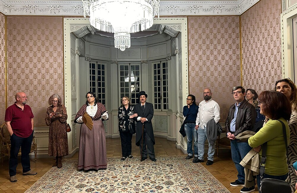 O Casal D'Albuquerque, amigos da família Santiago, lideraram a visita de ontem. Horácio e Carlota, assiduamente presentes nos encontros sociais dos Santiago de Carvalho e Sousa, acompanharam os visitantes numa viagem pelas memórias do palacete, desvendando as suas características arquitetónicas e ornamentais.